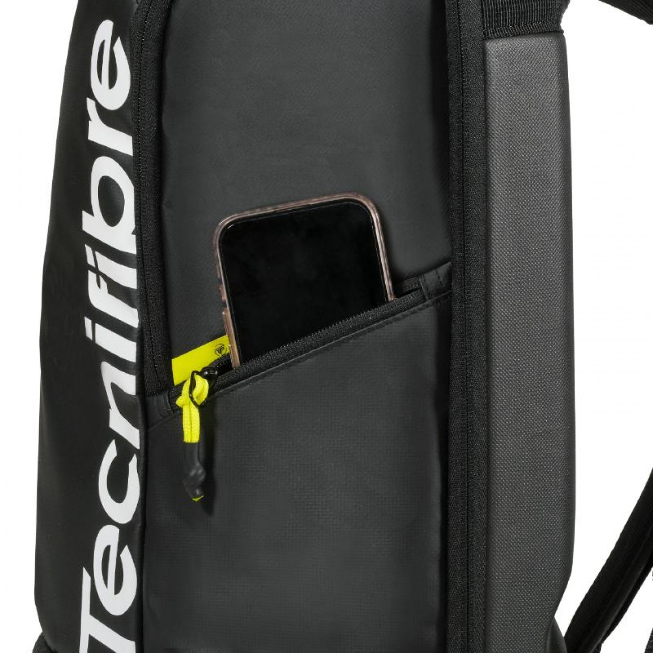 Design premium, nero opaco con dettagli gialli intensi, elegante e in linea con la gamma di racchette Tecnifibre.